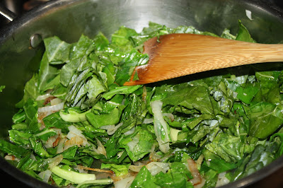 Once the onions were soft and brown, I added in the leafy greens. I don't even remember what they were. I'm thinking the greens from broccoli and cauliflower. Probably collards, too.